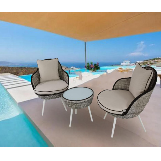 Steel frame with flat wicker cover with Spun polyester cushion and pillow for chair , cushion 5cm ,inside with polyfiber , Table with 5mm white printing glass