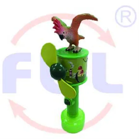 Featured here is a mini fan with candy case. The fan is adorned with a parrot on top and comes with space for storing candies. It has a button on the body and offers safe and simple operation.