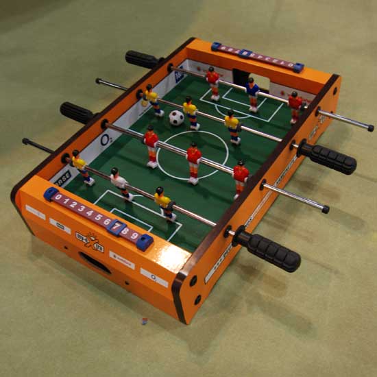 Featured is a mini foosball table specially designed for places with spatial limitation. Each side comes with 6 foosmen in two rolls. The score bar enables easy score marking. Have hours of fun with this space-saving soccer table.