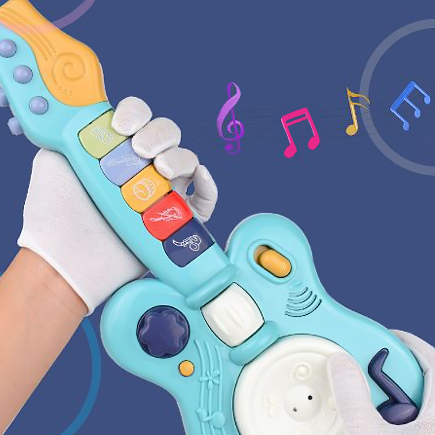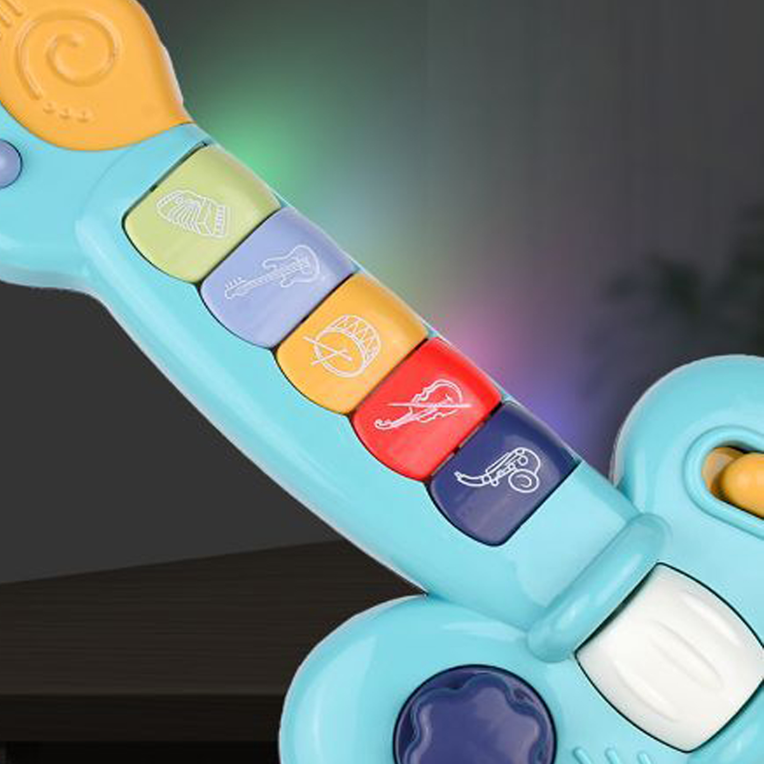 Press the small round button and the guitar will play 6 demo songs in turn, the keyboard makes colorful flashing lights while the music playing.