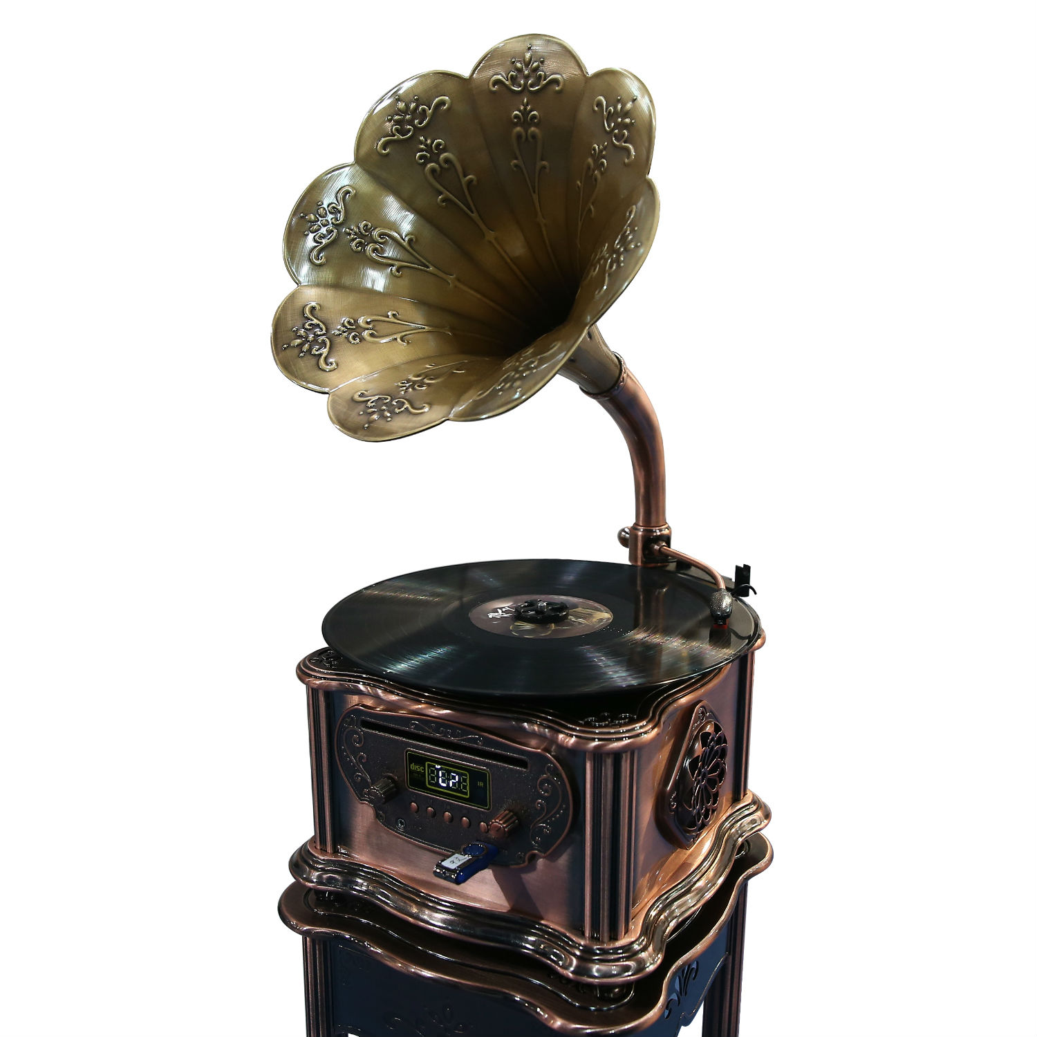 Material: Frame body: aluminium alloy; trumpet flower: copper, Color option: Pearl white, red bronze, champagne gold, USB play format: MP3 MAV FLAC, Max Capacity: 32G, CD play format: CD MP3 WAV