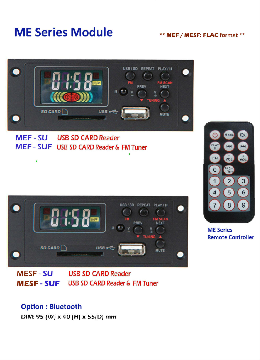 ME Series Module is a mini USB & SD Card Reader plus FM Tuner. It is good for use on PA, AMP or portable activity product.