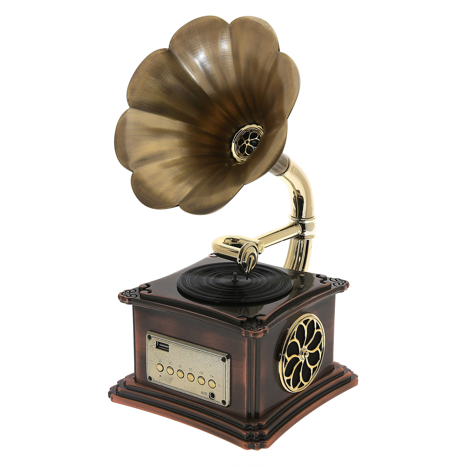 Material: Frame body: Alluminium Alloy, Trumpet flower: Copper, Color option: champagne gold, red bronze, rosewood red, Britain brown, USB Max capacity: 32G , Play format MP3 WAV FLAC