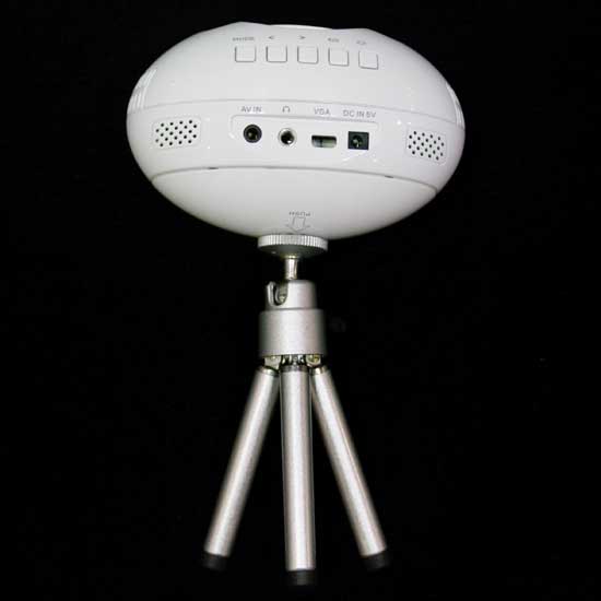 This mini projector comes with an iPhone or iPod docking station on the top. The buttons and hubs are neatly arranged at the back for easy control. The high-resolution image quality represents moving and still images clearly.