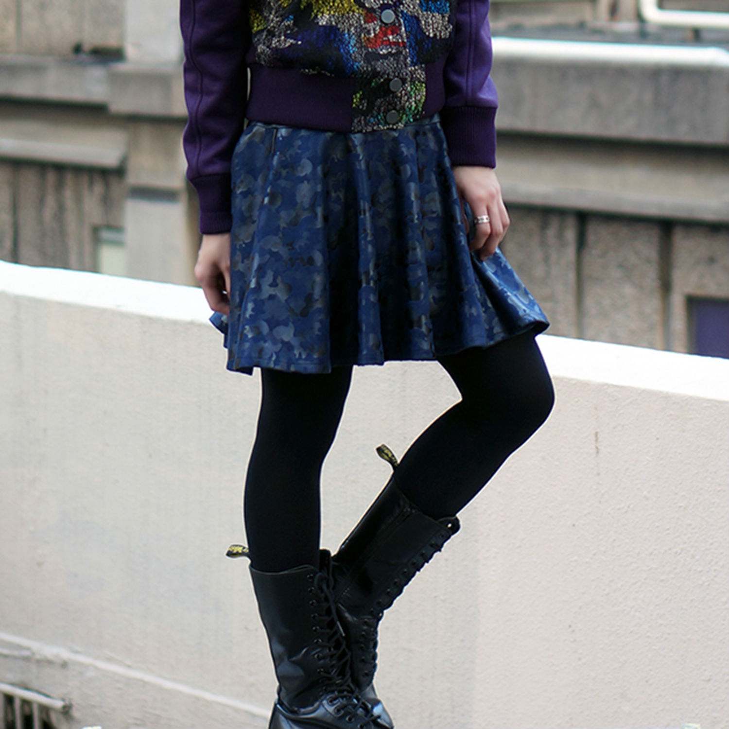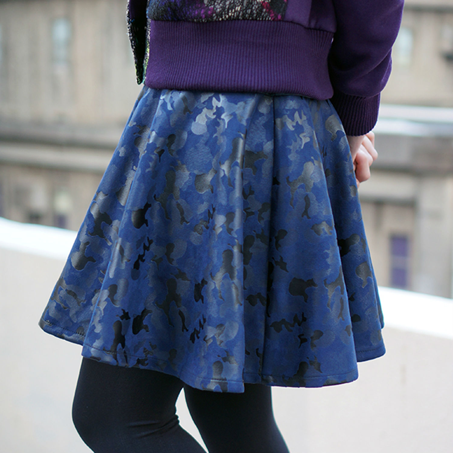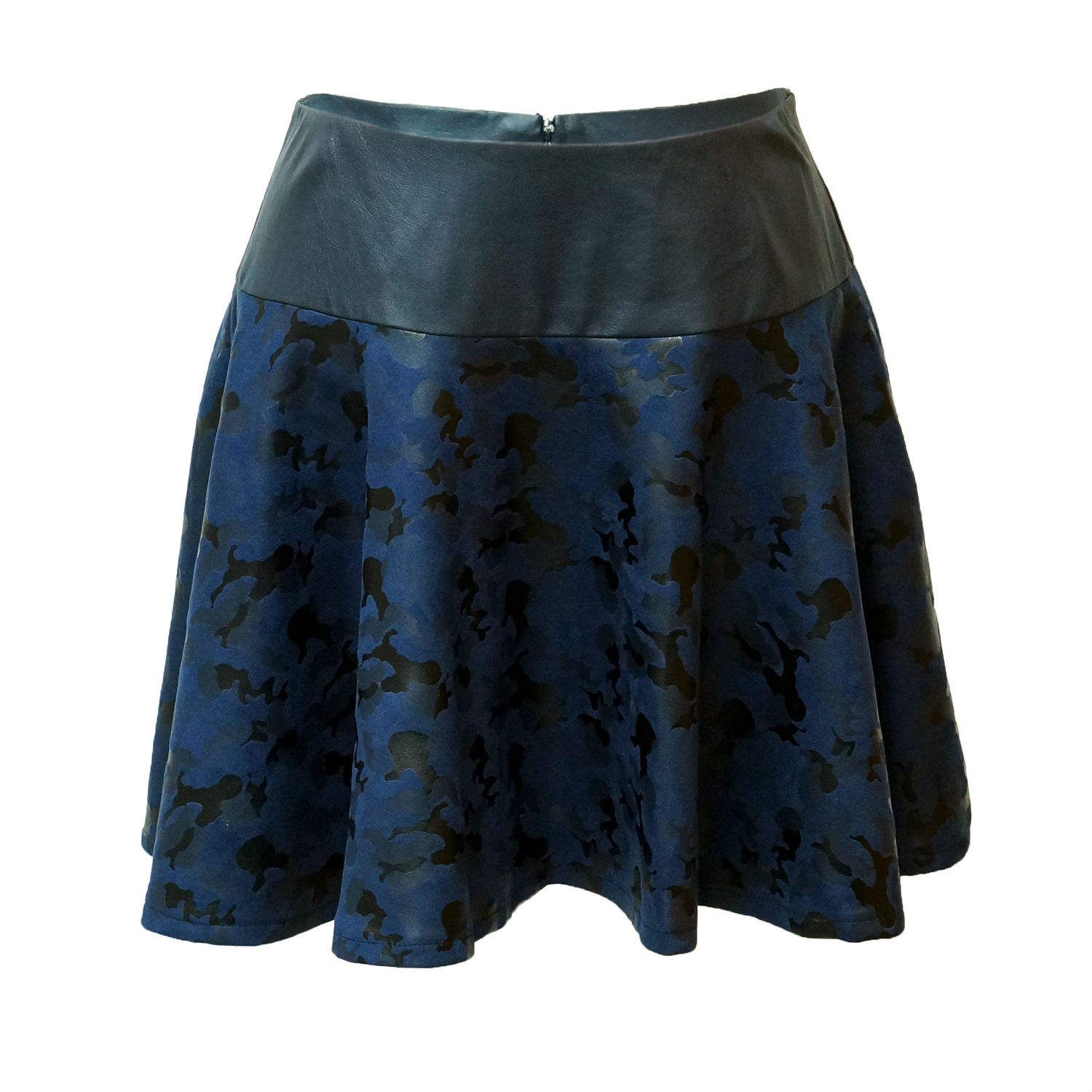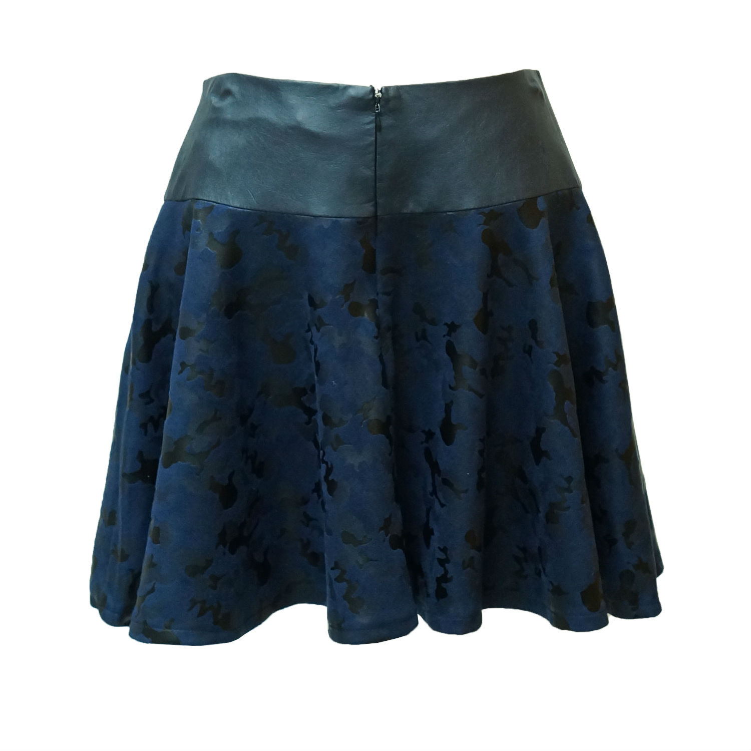 Flared knitted flocking miniskirt in navy. camouflage pattern at bpdy. Tonal faux-leather panel at waist. Concealed zip closure with hook and eyeat back. Tonal stitching. Fully lined.