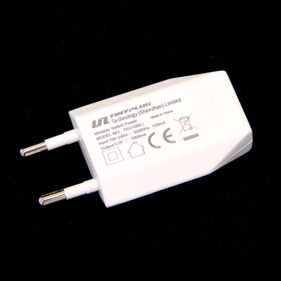 This USB charger features a white flat casing that gives robust construction. The top is designed with two round pins for connection. The mini-sized design allows you to carry it around easily.