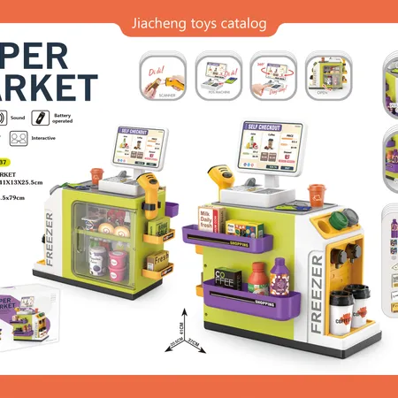 Pretend play store withscanner and calculator,simulated coffee production feature and a water outlet, By simulating real shopping scenes and providing props, children can develop a better understanding of daily life, enhance their hands-on skills, and improve their social interactions.