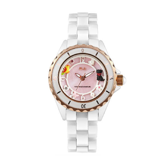 This is a handmade miniature watch with a fashionable design. It is made of quality ceramic for durability. This ceramic miniature watch is crafted with 3 hands and Arabic numeral hour markers for easy time reading.