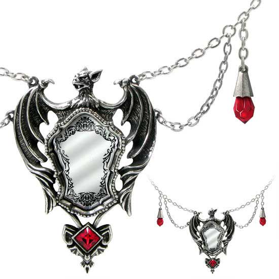 This Gothic-style necklace spotlights a dark bat-shaped pendant embedded with an acrylic mirror. The polished chain is accented with red Swarovski crystals. The edgy, chic necklace is perfect to accessorize any Gothic look.