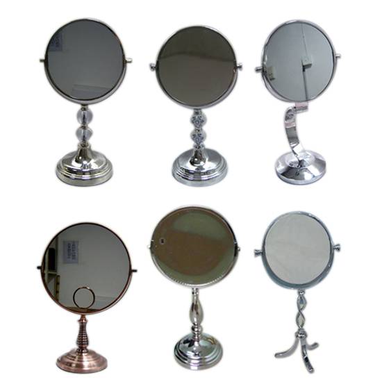 This is a collection of household mirrors. All mirrors in the collection are round. Each comes with a different style curving stand.