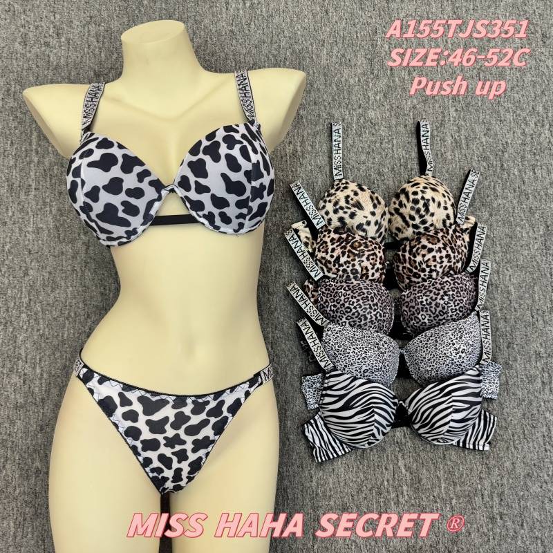 Introducing the Miss Haha Secret Animal Print Push Up Bra Set (A155TJS351), a bold fusion of style and support. This set features a push-up design that enhances your silhouette while providing ample lift and comfort. Adorned with eye-catching animal prints including cow, leopard, and zebra patterns, it brings a daring and fashionable touch to your lingerie collection. Available in size range 46-52C, it offers a tailored and supportive fit for larger cup sizes. Crafted with quality materials and branded straps, this lingerie set from Miss Haha Secret combines confidence-boosting aesthetics with everyday wearability, making it a standout choice for those who love to embrace bold fashion in their undergarments.