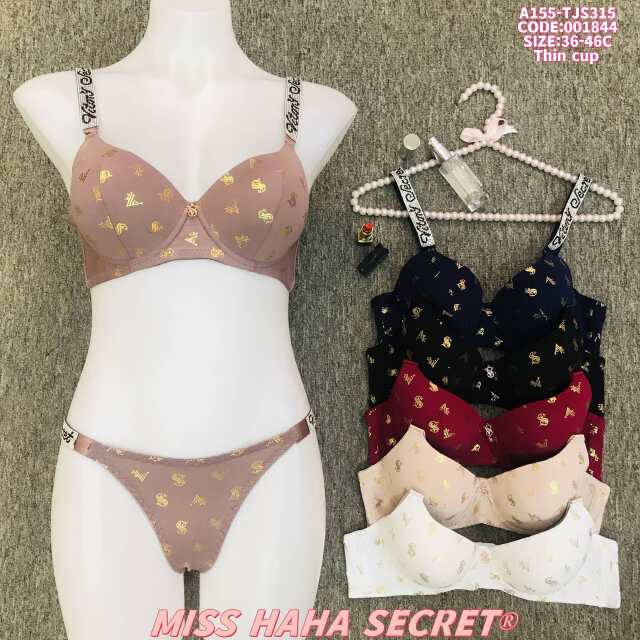 The Miss Haha Secret Thin Cup Bra Set features a distinctive printed pattern with gold-toned details and logo-adorned straps, offering a blend of fashion and comfort. Available in sizes 36-40C (code 001844, style A155-TJS315), the thin cup design ensures a natural fit. It comes in a variety of colors including pink, navy, black, red, and white, catering to diverse style preferences. Crafted by Miss Haha Secret, this set combines unique aesthetics with quality construction, making it an ideal choice for those seeking stylish and comfortable lingerie.
