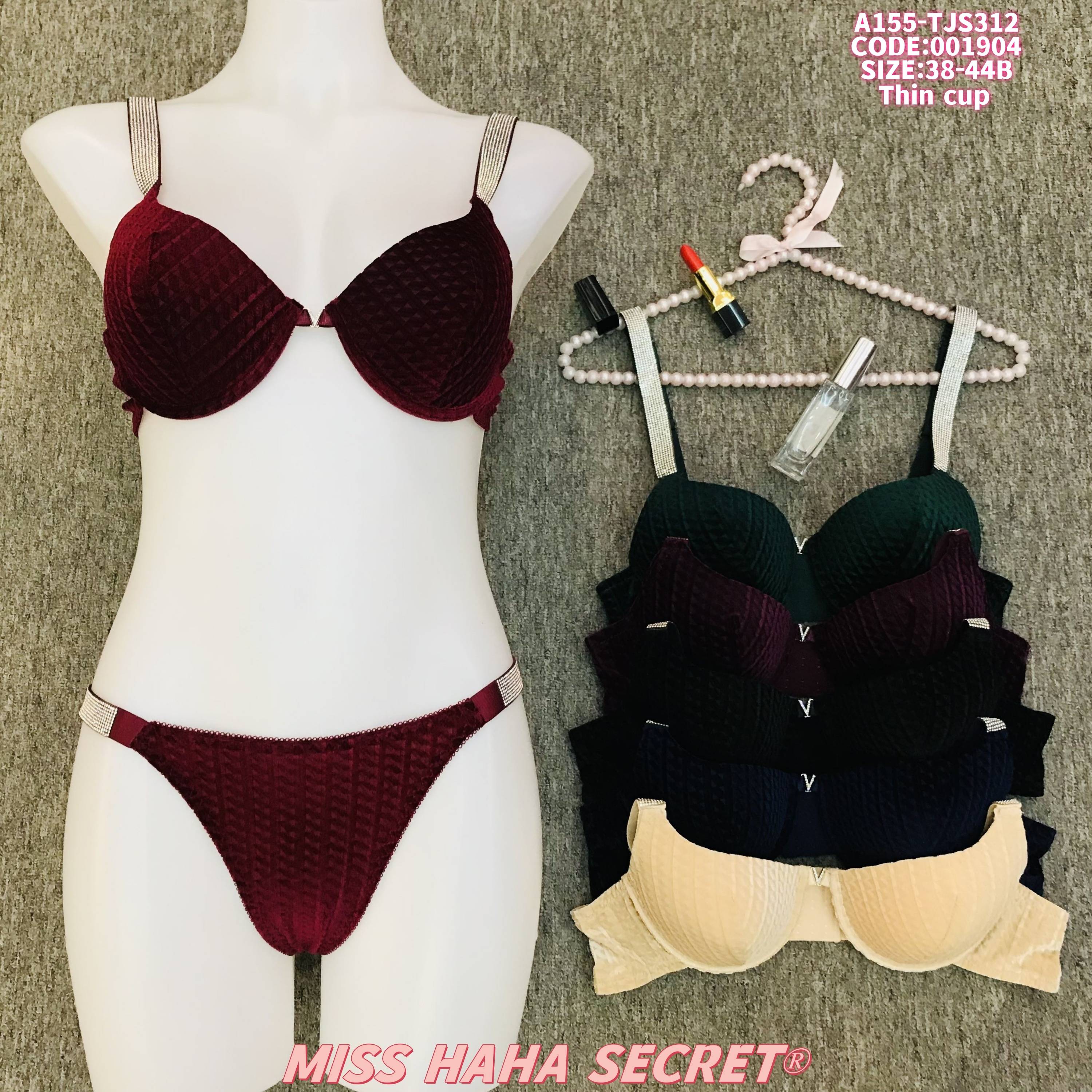 The Miss Haha Secret Thin Cup Bra Set stands out with its unique textured fabric and shiny decorative straps, merging style and comfort seamlessly. Available in sizes 38-44B (code 001904, style A155-TJS312), the thin cup design ensures a natural fit while the textured material adds a touch of sophistication. It comes in a range of elegant colors including burgundy, dark green, black, navy, and beige, catering to various fashion preferences. Crafted under the Miss Haha Secret brand, this set combines quality construction with aesthetic details, making it a stylish choice for those seeking both elegance and comfort in their lingerie collection.