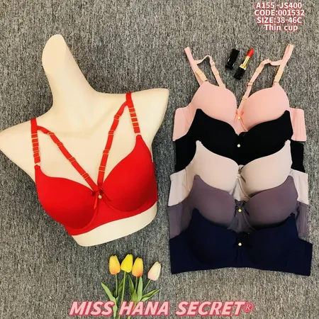 Experience lightweight comfort with the Miss Hana Secret A155-JS400 Thin Cup Bra (Code: 001532), designed for sizes 38-46G. This full-fit style features a sleek, smooth fabric, adjustable strappy details, and a subtle front bow accent—blending support with delicate style. Available in versatile hues (red, pink, black, beige, gray, navy), it’s ideal for daily wear while keeping you feeling confident and comfortable.