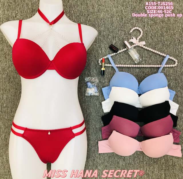 Enhance your intimate wear with the Miss Hana Secret Double Sponge Push Up Lingerie Set. This set features a double sponge push-up bra and matching panty, designed to deliver exceptional lift and a flattering silhouette. Available in sizes 46-52C (code 001465, A155-TJS256) and a range of elegant colors including red, blue, white, black, mauve, and pink, it combines style and support. The set also includes charming details like strappy accents on the panty and optional pearl embellishments, adding a touch of sophistication. Perfect for those seeking a confident and stylish look, this lingerie set from Miss Hana Secret is ideal for elevating your everyday comfort and special-occasion allure.