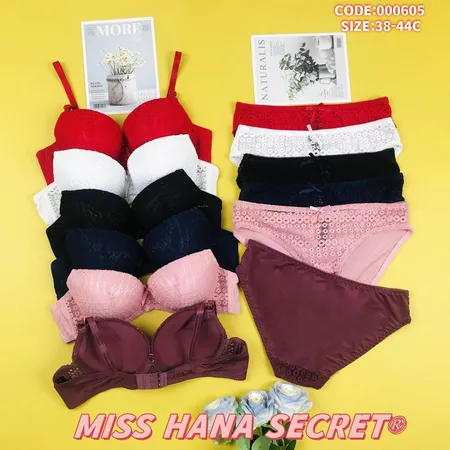 Introducing the Miss Hana Secret Lace Lingerie Set, a beautiful combination of elegance and comfort. Featuring intricate lace detailing on both the bras and matching panties, this set is available in a range of romantic colors including red, white, black, navy, pink, and burgundy. Sized 38-44C (Code: 000605), it provides a tailored fit for various body types. Crafted with delicate lace and soft fabrics, it offers both a chic aesthetic and a comfortable wear experience. Whether for special occasions or everyday luxury, this lingerie set adds a touch of femininity and sophistication to your intimate collection.