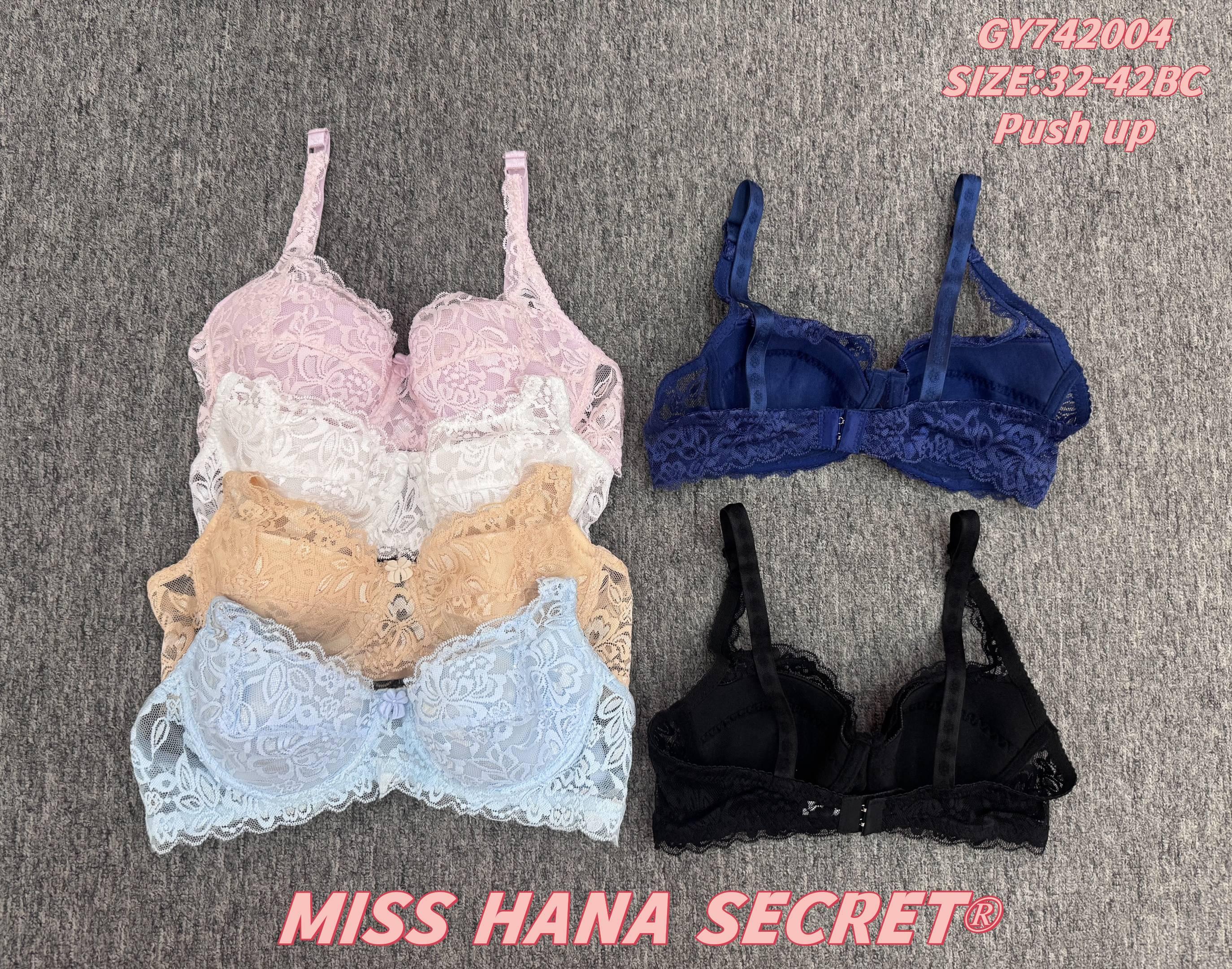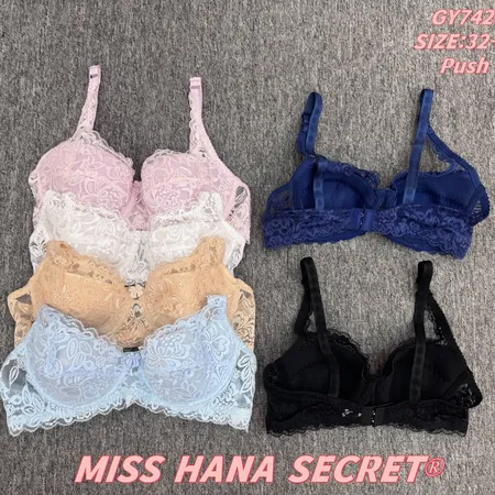 The Miss Hana Secret Lace Push Up Bra Collection blends elegance and enhancement. It features intricate lace detailing for a feminine touch, push-up design for a lifted silhouette, and comes in colors like pink, white, beige, light blue, navy, and black. Sized 32-42BC (code: GY742004), these bras offer both supportive structure and stylish allure, making them an excellent choice for those seeking to combine comfort and sophistication in their intimate wear.