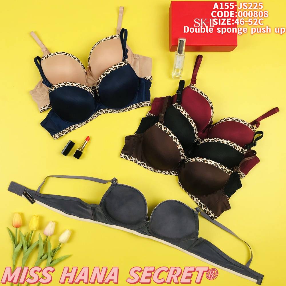 Elevate your lingerie collection with the Miss Hana Secret Push-Up Bra! Featuring a stylish leopard-print trim paired with smooth solid fabrics (navy, burgundy, black, brown, gray), this bra is designed with double sponge padding to deliver a lifted, enhanced silhouette. It offers a comfortable fit for sizes 46-52C, perfect for daily wear or special occasions. The sleek, supportive design combines fashion and functionality—upgrade your undergarment drawer with this versatile, eye-catching set!