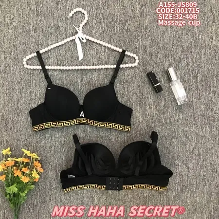 Upgrade your lingerie game with this sleek Miss Hana Secret bra set! Featuring a bold black design accented by classic Greek key patterns, these massage cup bras offer both style and support. The push-up silhouette (with details like a decorative buckle on one style) enhances your shape, while the soft fabric ensures all-day comfort. Available in size 32-40B, this set blends modern edge with feminine flair—perfect for adding a chic touch to your intimate wardrobe!