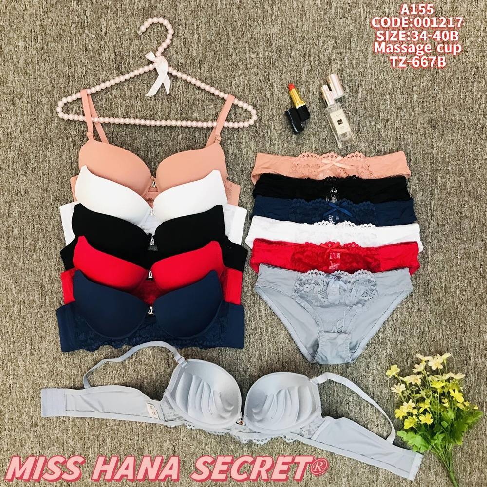 The Miss Hana Secret Massage Cup Lingerie Set merges comfort and elegance. It features a massage cup design for enhanced comfort, delicate lace accents for a feminine touch, and comes in colors like peach, white, black, red, navy, and gray. Sized 34-40B (code: 001217), this set includes matching bras and panties, offering both supportive functionality and stylish detail, making it a great choice for those seeking a balance of comfort and sophistication in their intimate wear.