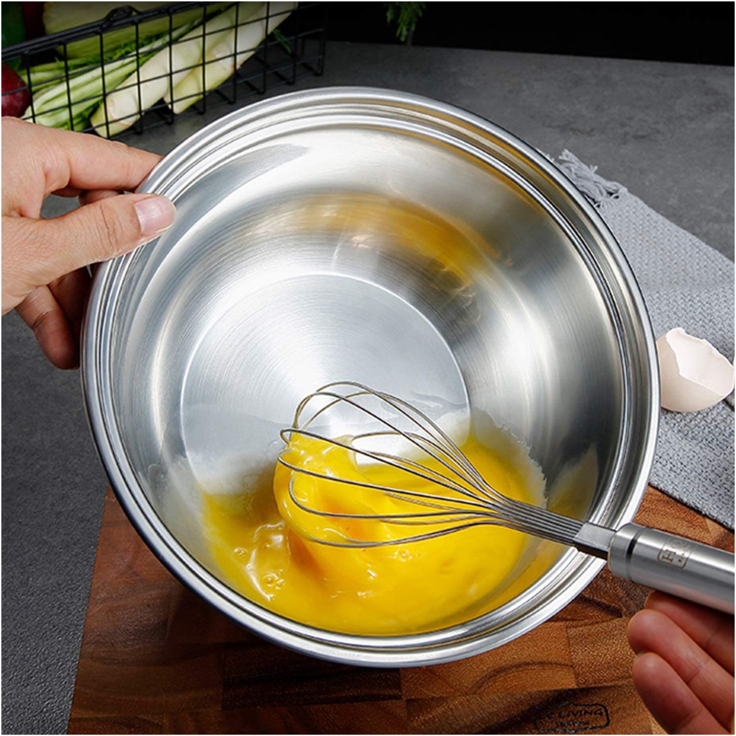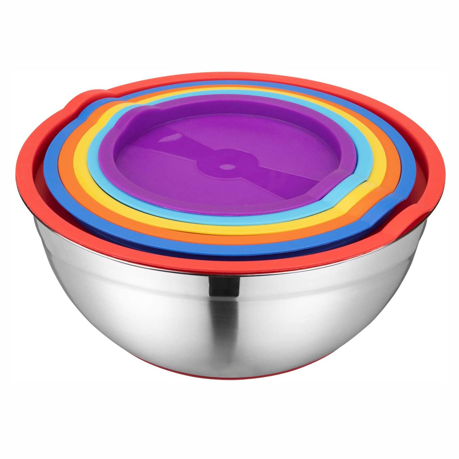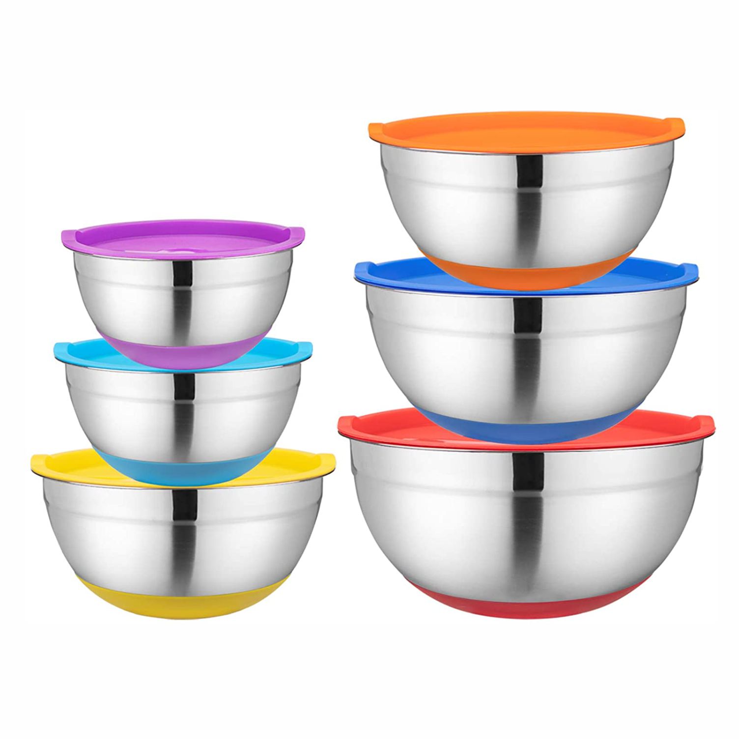 [NON SLIP SILICONE BOTTOMS] Flat silicone bases prevent the metal bowls slippage when mixing, you need not to worry about the bowls will wobble when mixing, beating and whipping.