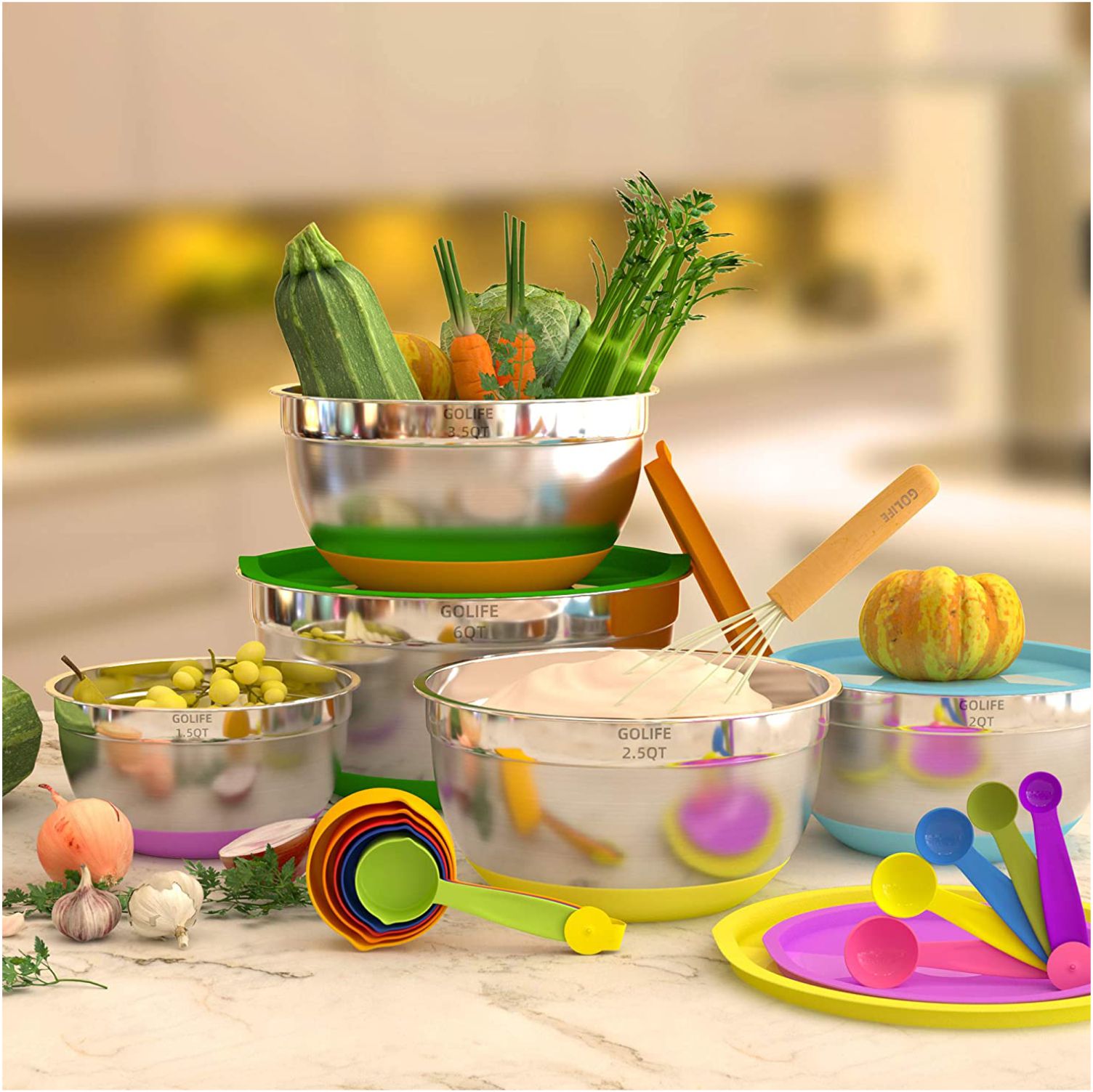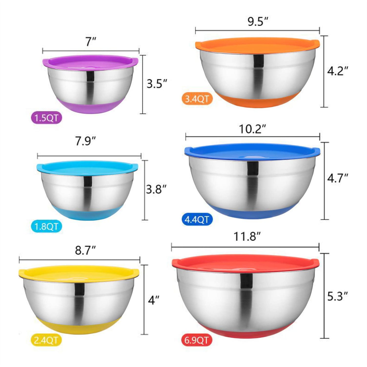 [LARGER BOWL SIZES]: Our stainless bowls deeeper than standard bowl sets, allow for larger servings . This set contains sizes1.5, 2.0, 2.5, 3.5, 7 quarts, that gives you much more flexibility, and less mess, satisfy your demands for mixing large batters, tossing salads, washing vegetable, marinating and storing, etc