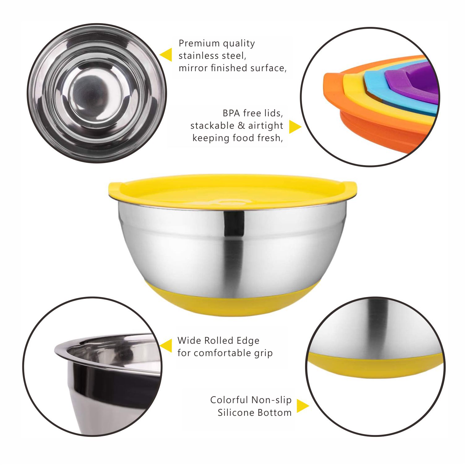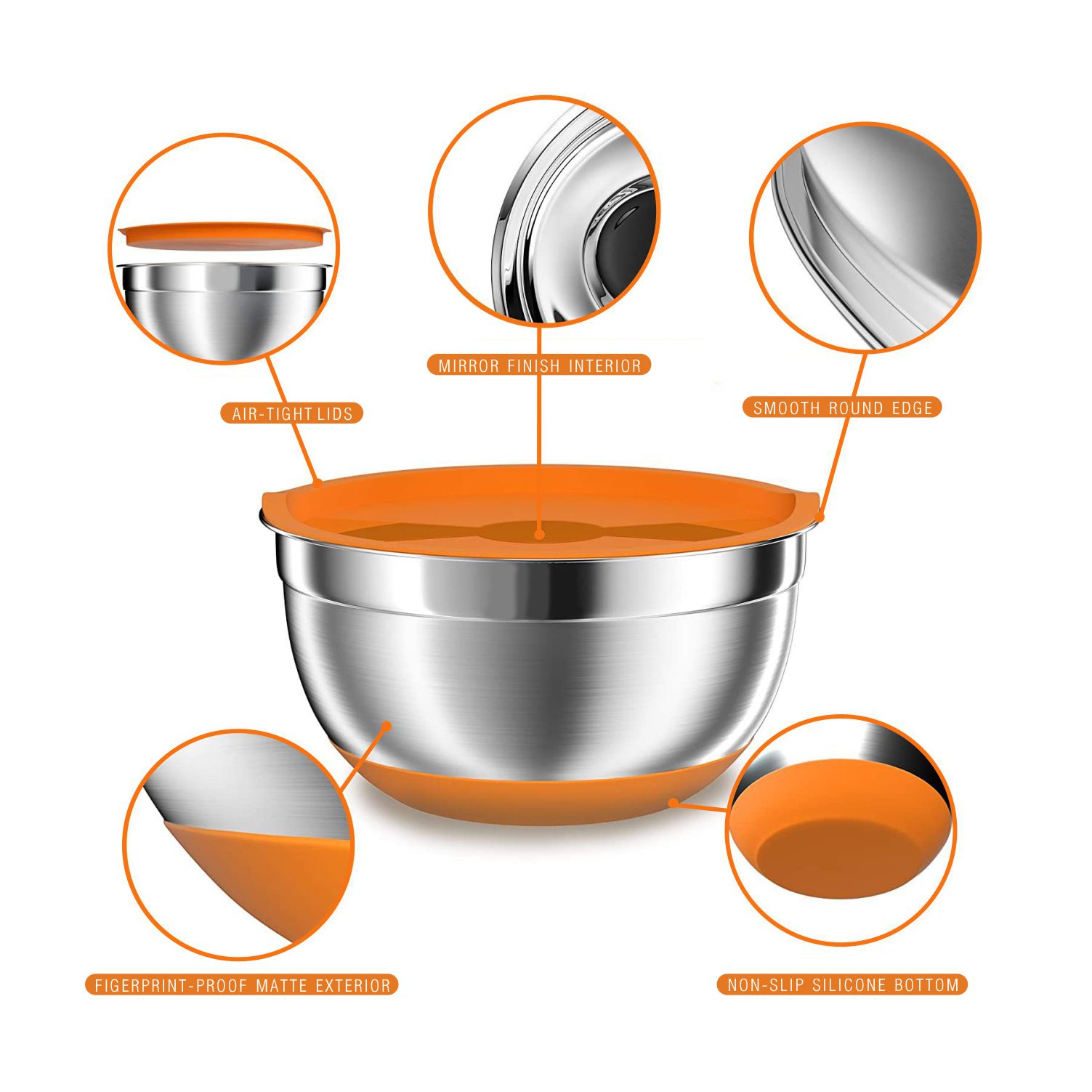 [PREMIUM MATERIAL]: Each bowl is made of high-quality heavy gauge stainless steel, which is resistant and rustproof. Mixing bowls feature a mirror finish interior and fingerprint-proofexterior. High-quality food grade stainless steel, you and your family can ues it with peace of mind