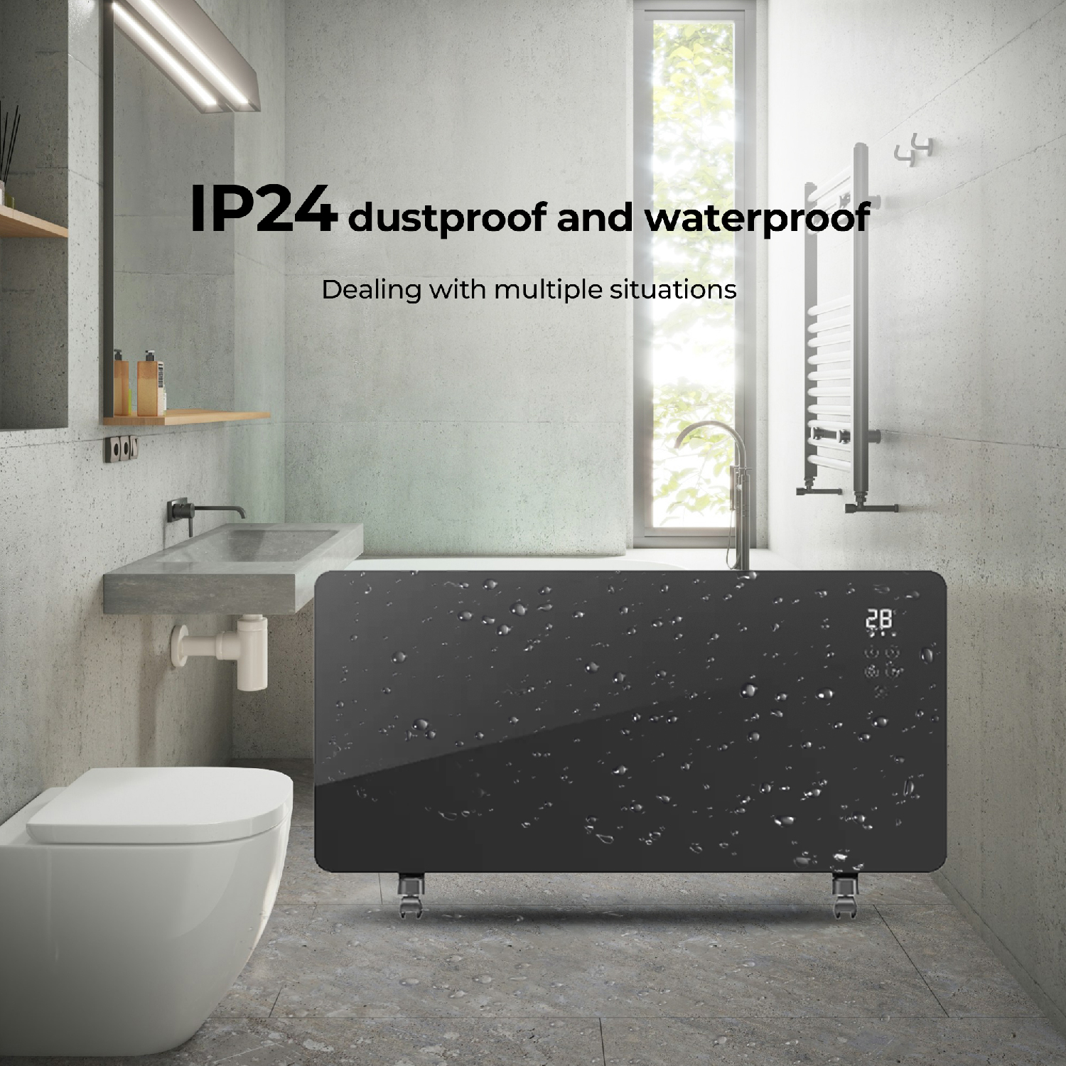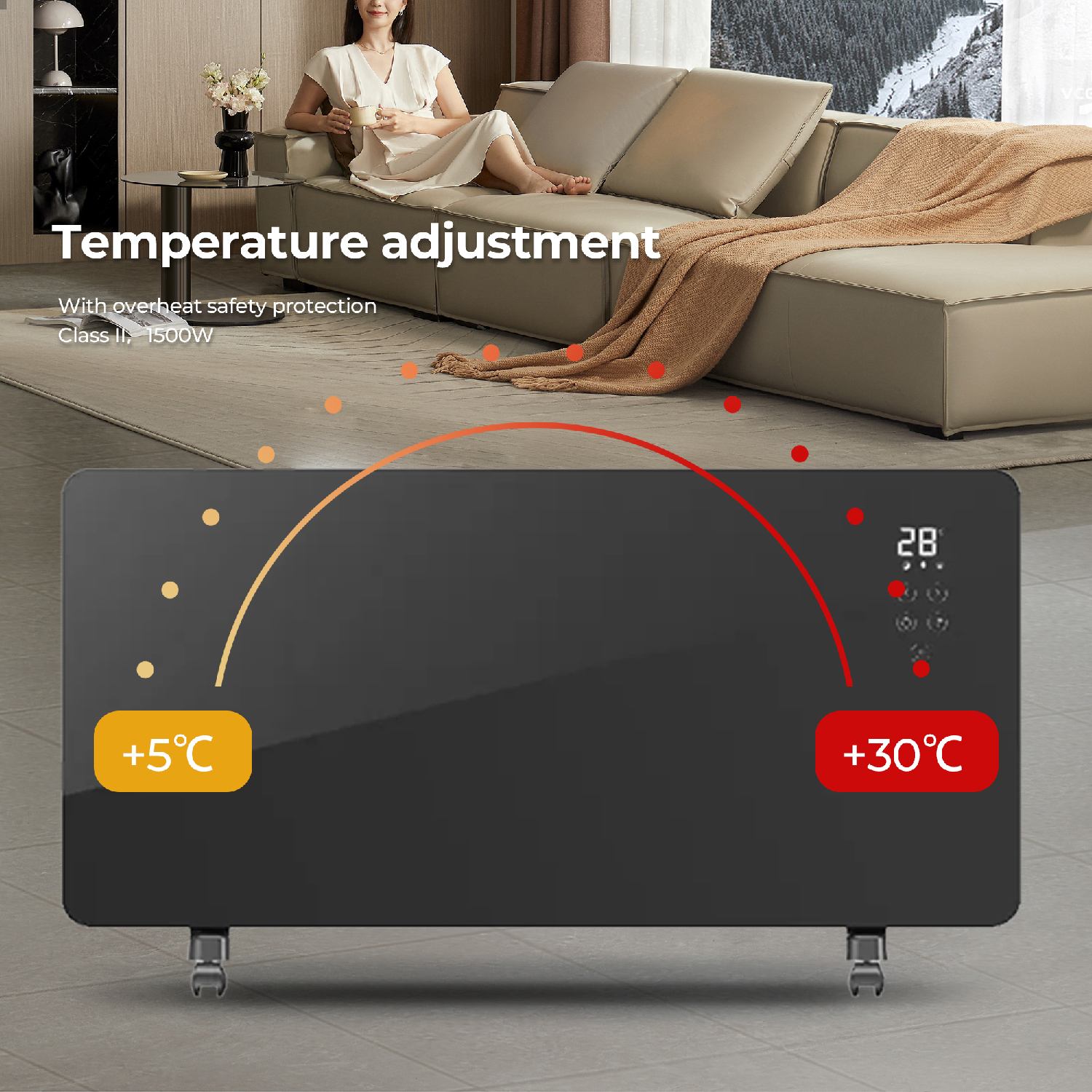 This heater warms your room quickly while its sleek glass panel design adds a modern touch to any interior. Its mobility allows you to move it easily between rooms, providing comfort wherever you need it.
