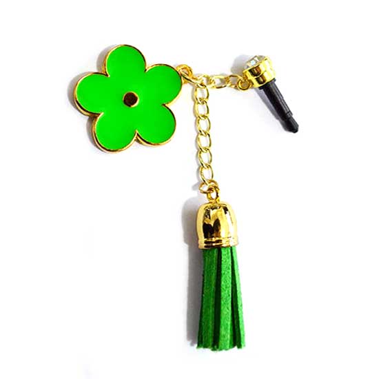This mobile phone earphone jack plug is adorned with a green flower charm and a PU tassel. The earphone jack plug can effectively prevent dust from entering the headphone jack. It makes a stylish and functional accessory for ladies' mobile phone.