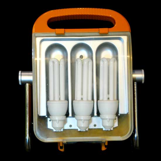 The mobile worklight is complete with a sturdy splash-proof housing for outdoor environments. It is operated by three 23W energy saving lamps with high brightness. This compact and portable worklight is ideal for working under dim environments.
