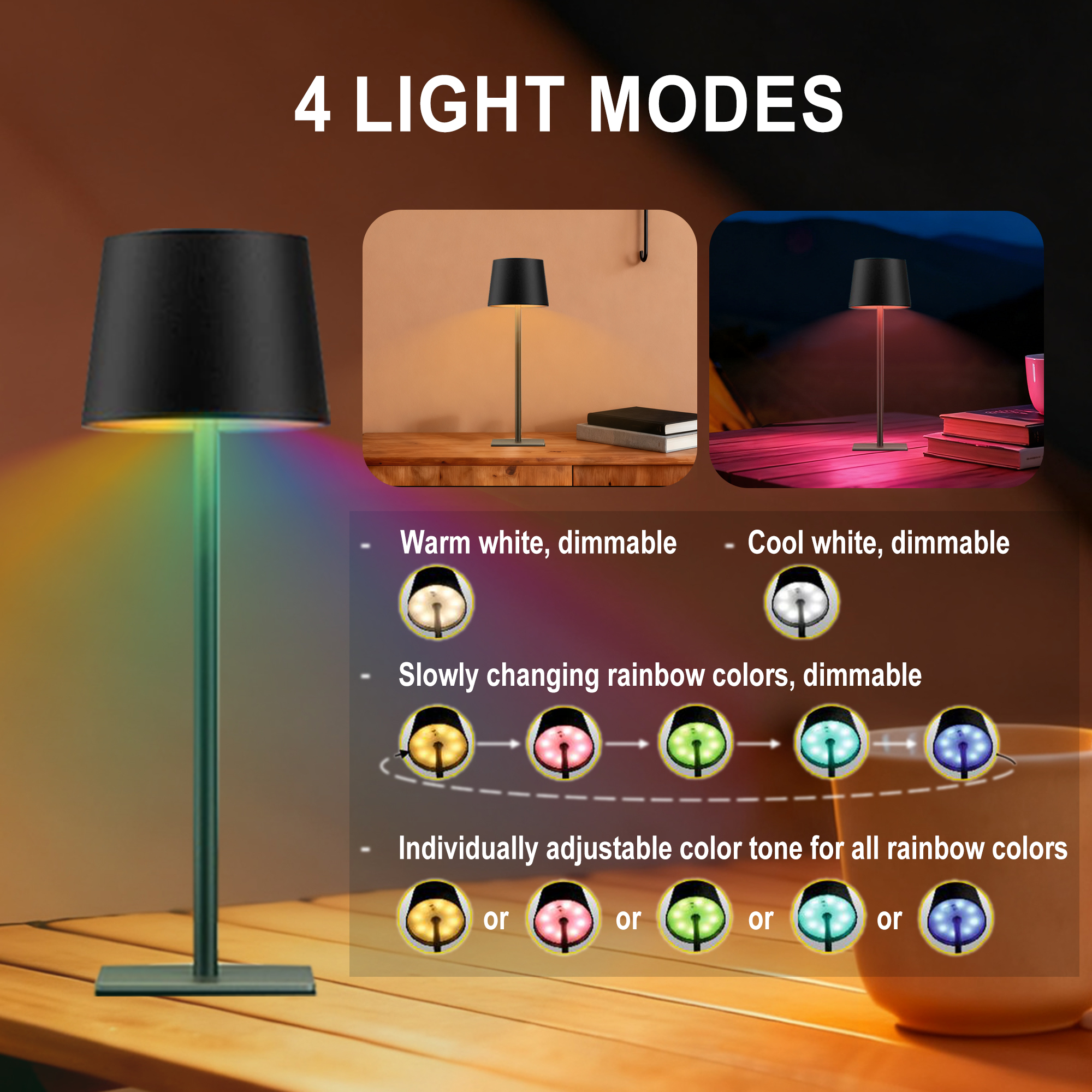 3. 4 Light Modes - warm light/white light/gradient color light/color lights