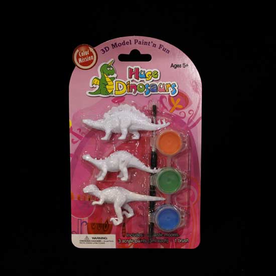 The model painting set designed for kids features an interesting dinosaur design. This set includes three popular dinosaur models, a brush and three paints. The colored models can be used for role-play games, showcasing as a display item or packed as a gift for friends.
