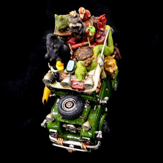This colorful model van is highlighted by various kinds of animals on and inside the van, creating a rich scene. Finely painted with vivid colors, the wild animals look livelier. The model is perfectly polished to create a shimmering surface. Decorate your house with this eye-catching model.