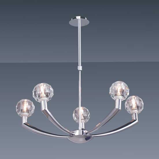 This modern ceiling lamp features five transparent ball-shaped shades and curved arms. It emits soft yellow light to create a relaxed ambiance in your living space. The stylish ceiling lamp will brighten up any interior decor.