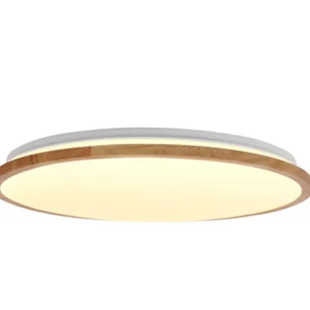 This is a round ceiling light. The upper part is a white ring, and the lower part is a wooden frame. There is a light strip between the two layers. The inner lighting surface emits a soft warm light, presenting a natural, cozy and textured look.