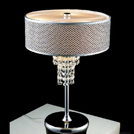 This is a modern table light with a noble and elegant design. It features a durable round base with a chrome finish. The round fabric lampshade and decorative crystal elements complete this lamp for a trendy and deluxe touch.