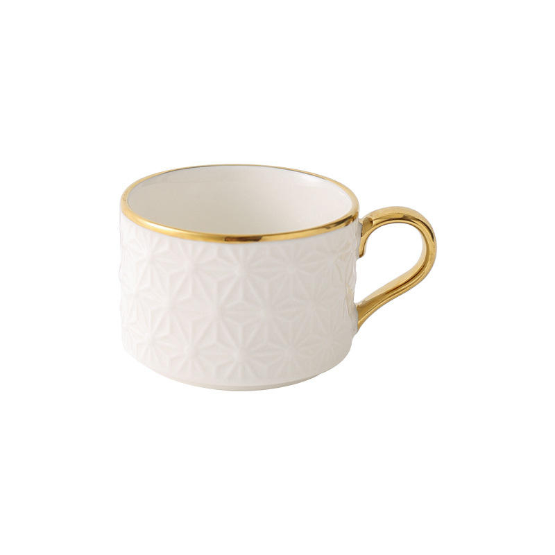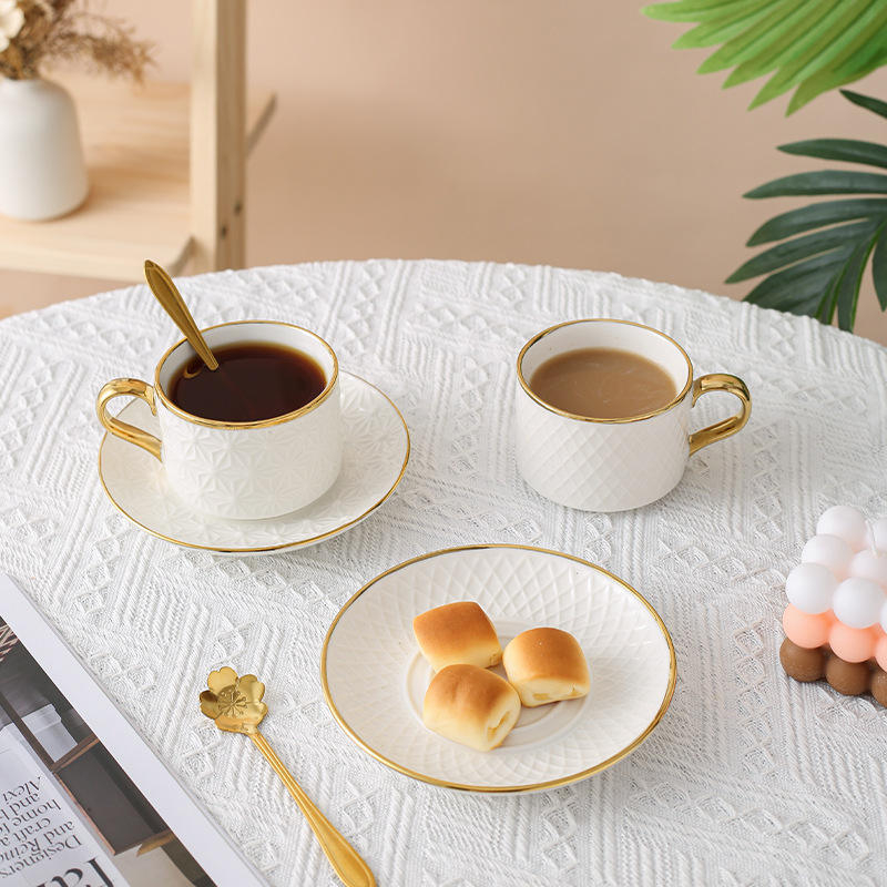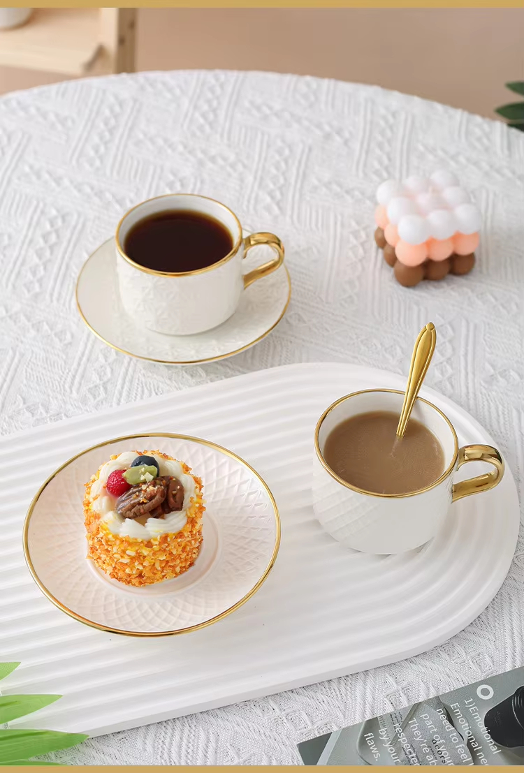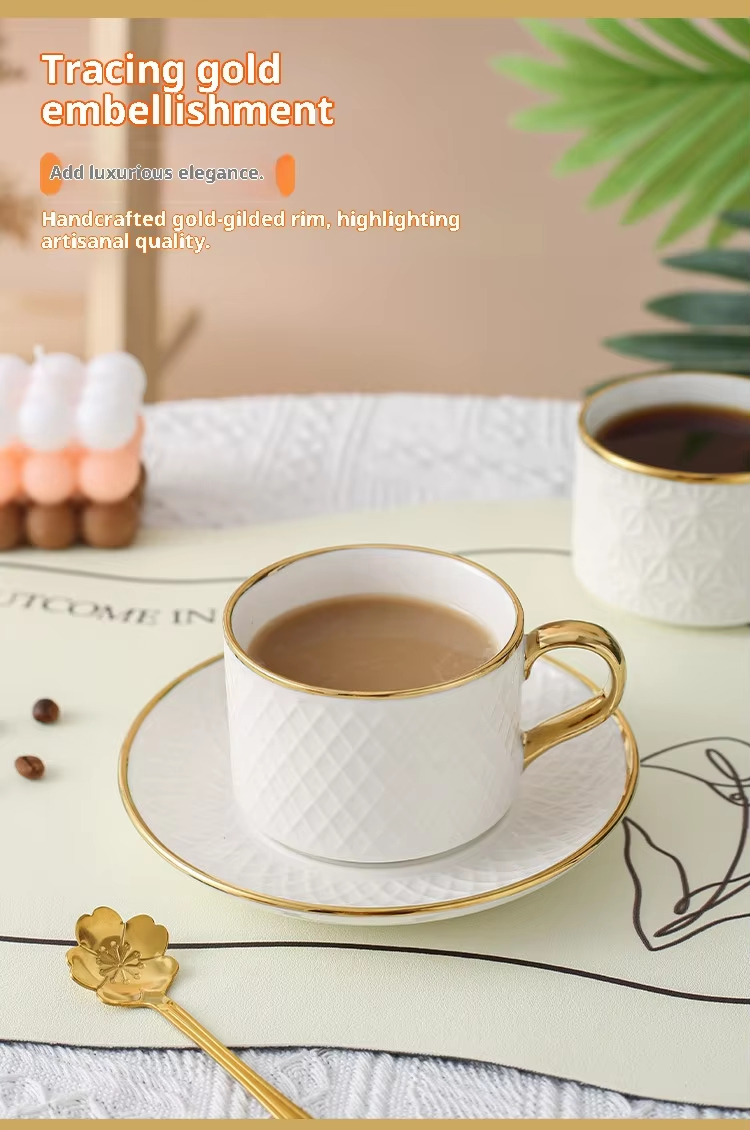 Modern Minimalist Embossed Ceramic Coffee Cup and Saucer Set with Gold Rim and Handle 200ml Capacity Reusable and Durable
