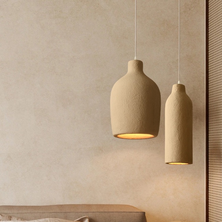 Handcrafted lightweight pendant lights featuring a unique textured finish and organic shapes. Made from high-density polystyrene with specialized resin coating, these architectural fixtures bring warmth and Japanese wabi-sabi aesthetics to any space.
