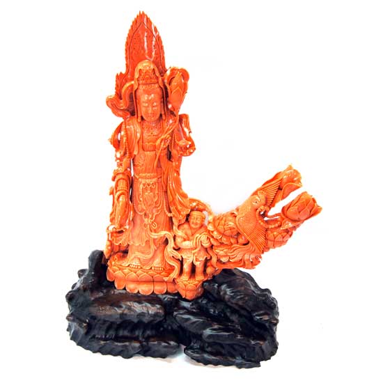 Finely crafted from quality momo coral, this carving vividly features the design of Guanyin Buddha standing on the lotus blossom. Guanyin is often regarded as the goddess of mercy in the East Asia Buddhism. This exquisite coral carving makes a great decoration in Buddhists’ home.