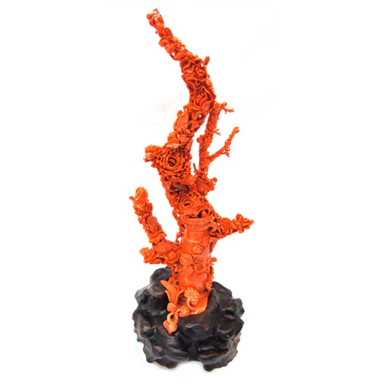 This stunning coral carving is finely crafted from high-quality momo coral. It vividly features the design of a vase with blooming flowers. The exquisite coral carving showcases excellent craftsmanship with refined details.