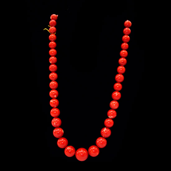 The necklace is strung with sharp red round beads made of well-sourced coral. Each of the beads comes in a plump shape and owns an arresting surface luster. This necklace will add class and lots of visual interest to your neckline.