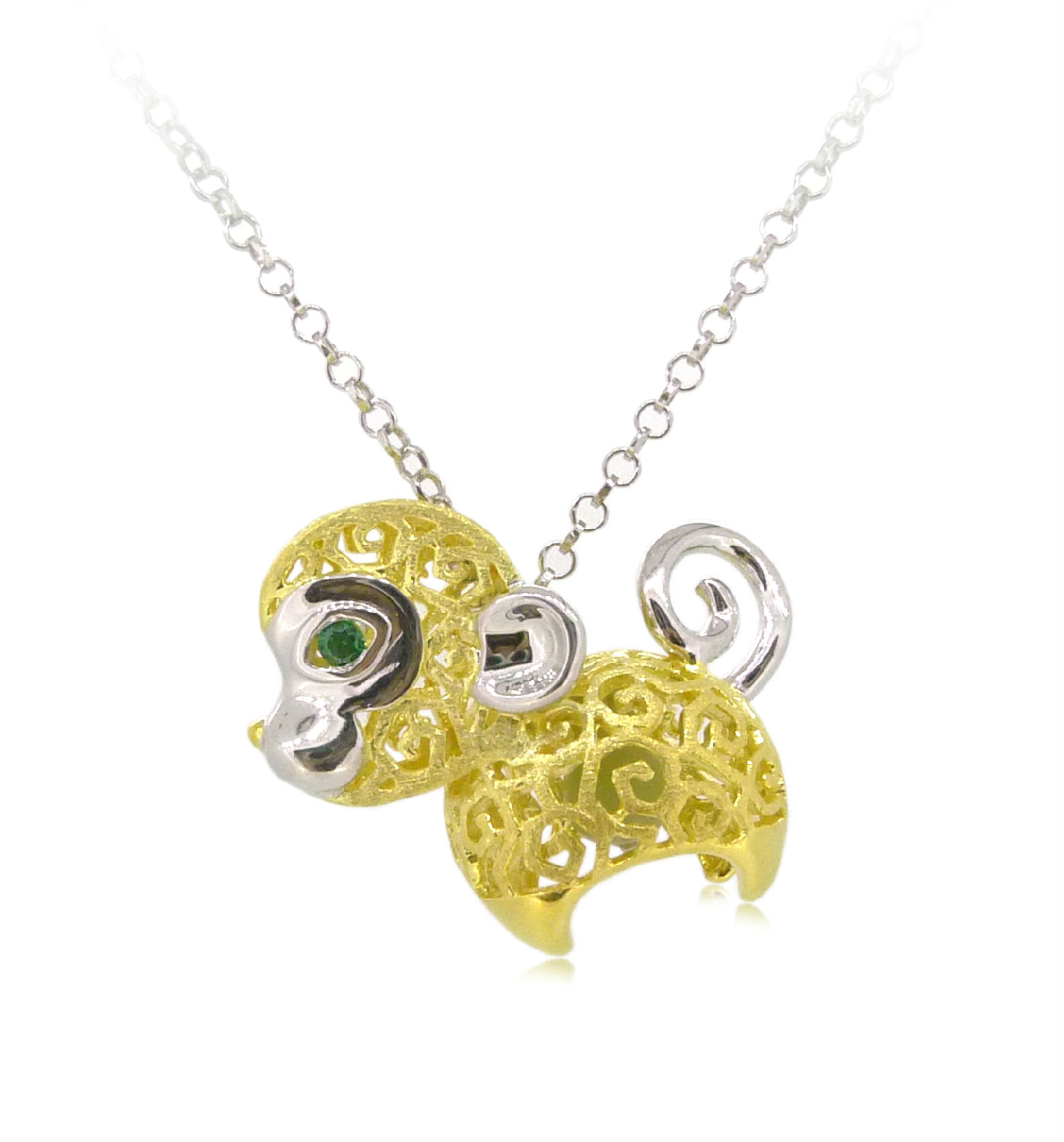 The Monkey’s body is made with our brand’s special texture. We set the green Swarovski stones in the eyes and also set a nature fluorite inside the body. When you put the pendant in a dark area, it will fluoresce like a real lantern.