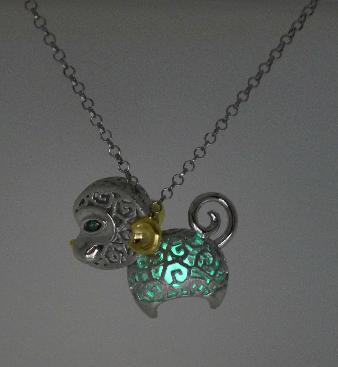 The Monkey’s body is made with our brand’s special texture. We set the green Swarovski stones in the eyes and also set a nature fluorite inside the body. When you put the pendant in a dark area, it will fluoresce like a real lantern.