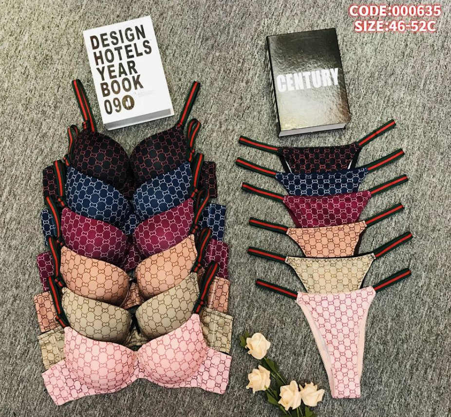 Introducing this Monogram Pattern Lingerie Set, a stylish fusion of iconic design and comfort. Featuring a distinctive monogram print and straps with red-green stripes, this set includes bras and matching panties available in a range of chic colors like black, navy, burgundy, beige, and pink. Sized 46-52C (Code: 000635), it offers a tailored fit for diverse body types. Crafted to combine fashion-forward aesthetics with everyday wearability, this lingerie set is ideal for those seeking to add a touch of trendy sophistication to their intimate collection.