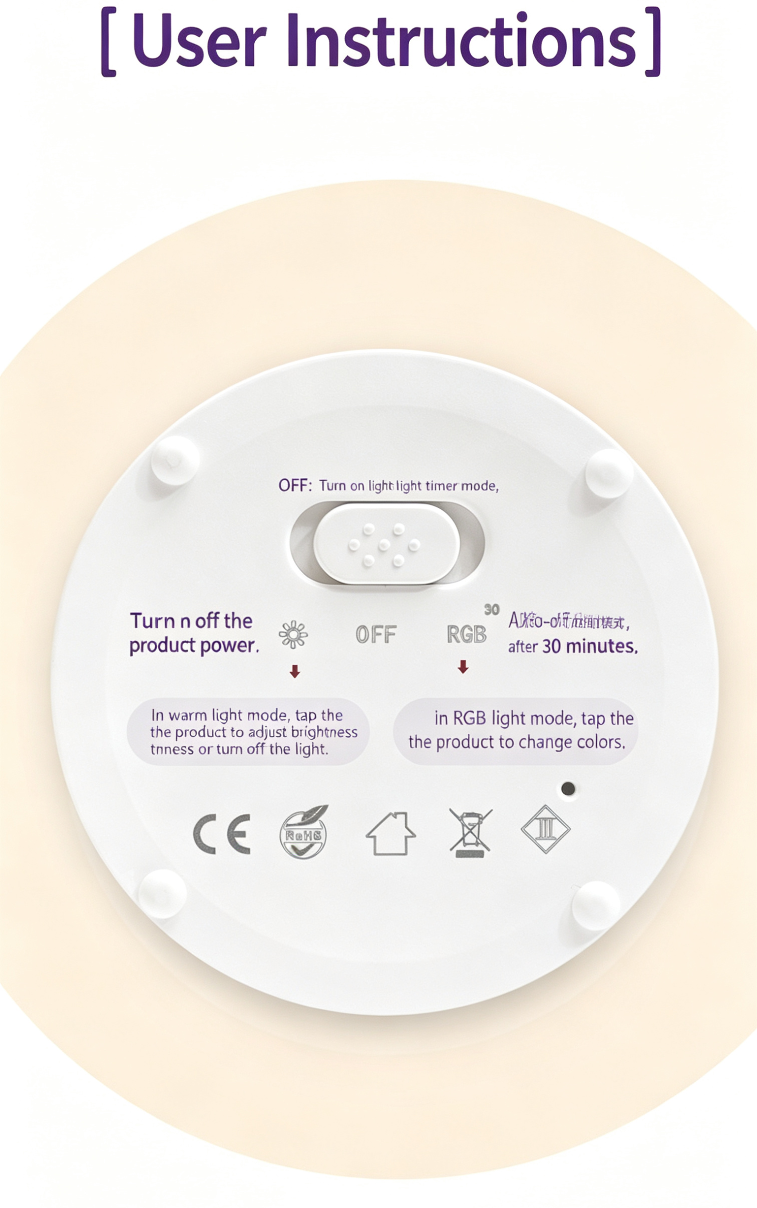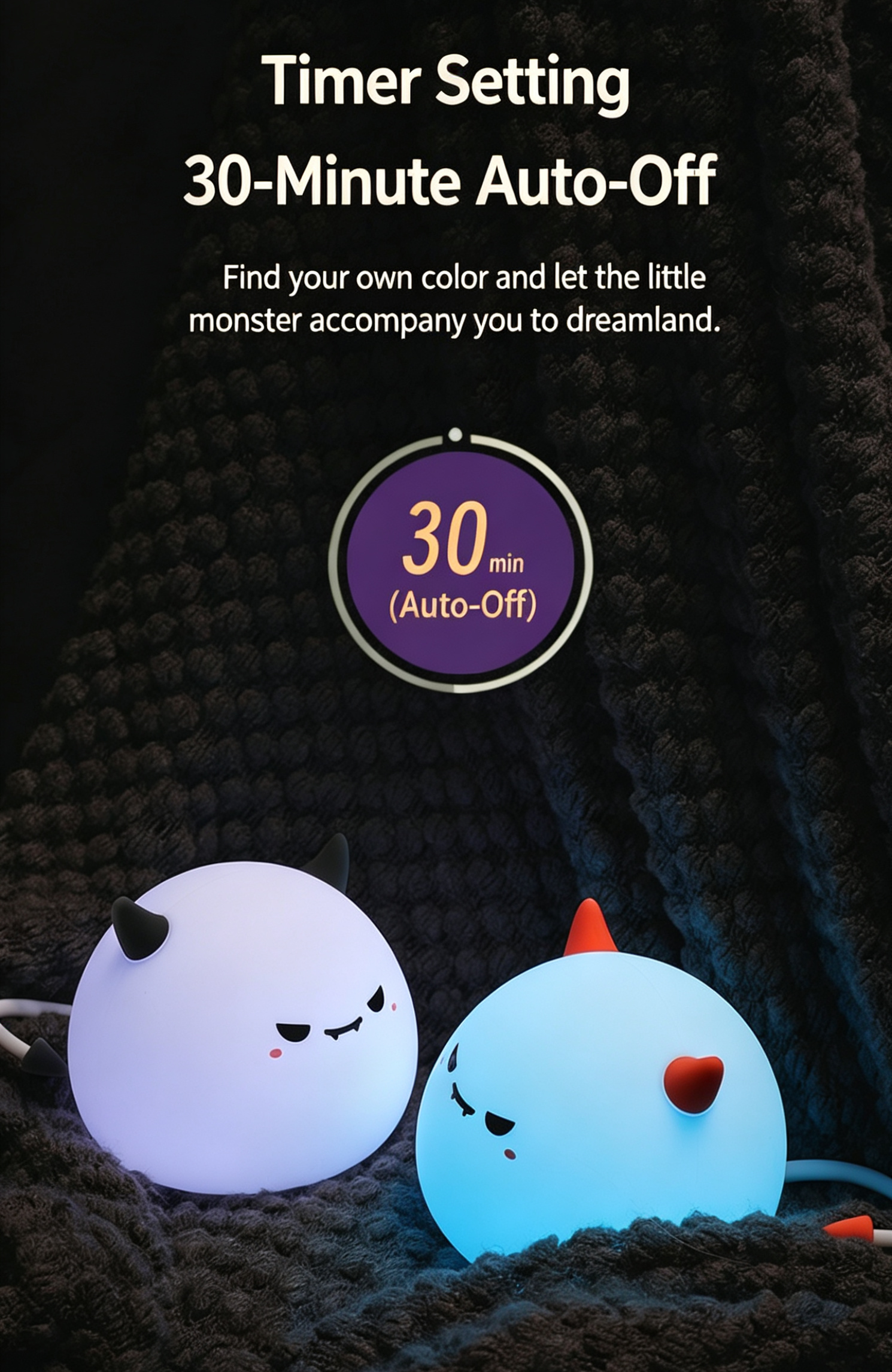 - RGB Timer Mode: Activate color light 30-minute timer mode, auto-off after 30 minutes. Tap to switch colors.