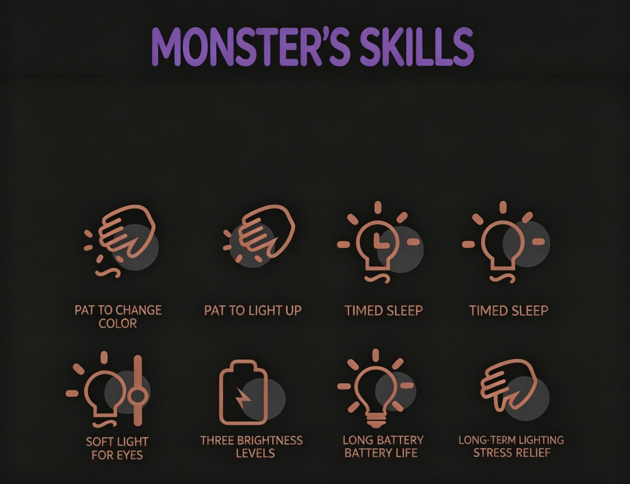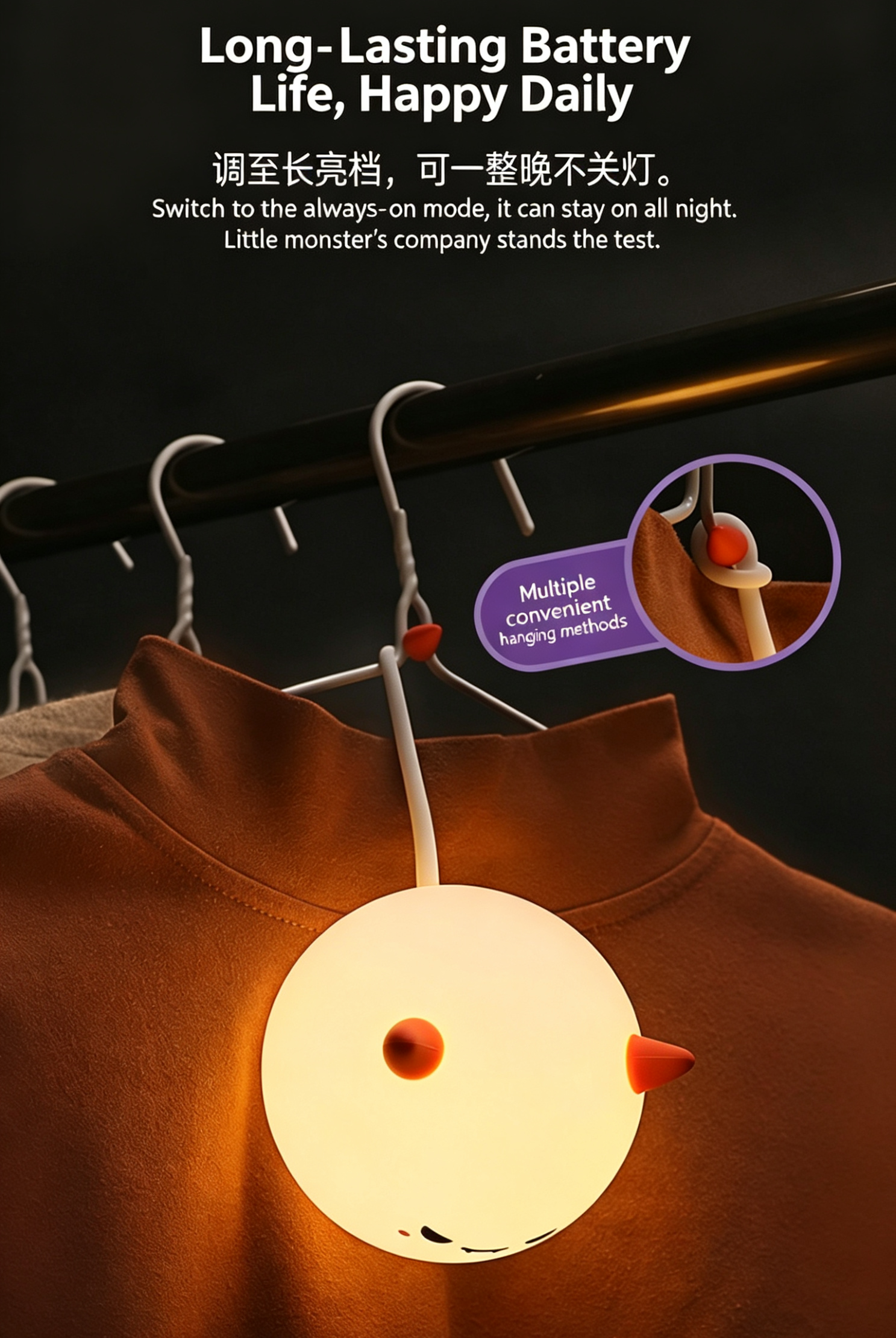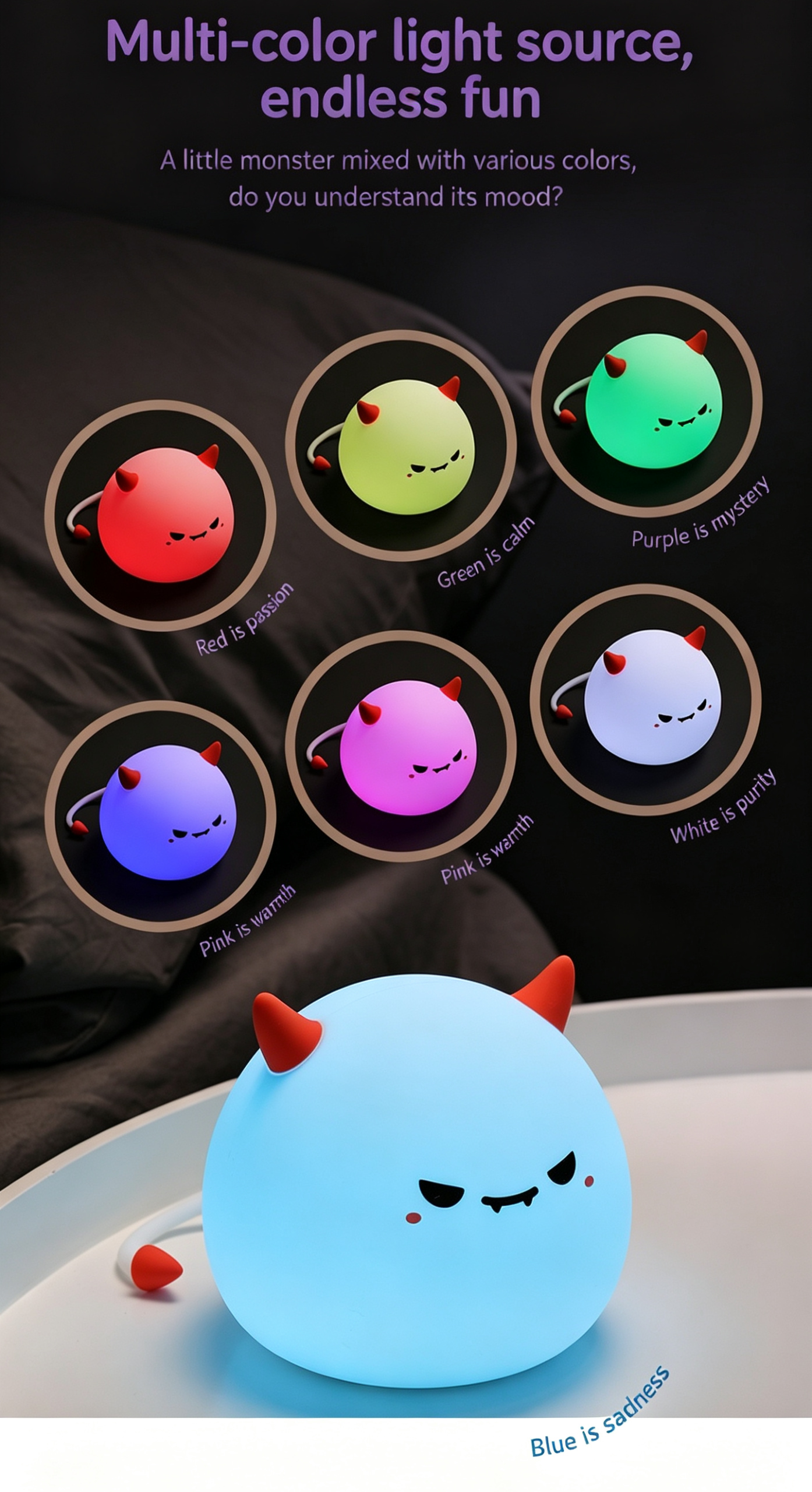 Our cute Monster Silicone Night Light is the perfect blend of fun, comfort, and practicality! Made of soft, skin-friendly silicone, it features a tap control design to easily turn on/off, adjust brightness, or switch 7+ RGB colors. With 3 dimmable warm light modes, a 30-minute auto-off timer, and eye-friendly glow, it’s ideal for bedtime, Halloween decor, bedroom, and night market gifts. Rechargeable via Type-C, durable and squeezable, this adorable monster lamp is a great companion for kids and a perfect gift for any occasion!