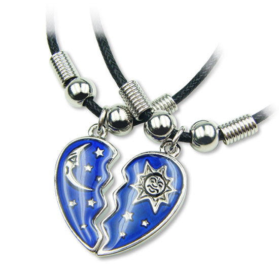 Presented is a lovely pendant designed in a splitting heart shape. The center features embossment of moon or sun patterns set on color-changing material. The color of the pendant changes to reveal your emotions at the time.