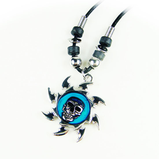As shown is a fashionable pendant featuring an embossed skull decoration. The frame comes in a pointed-gear shape to exude eye-catching vigor. The skull is surrounded by color-changing material to reveal your emotions.