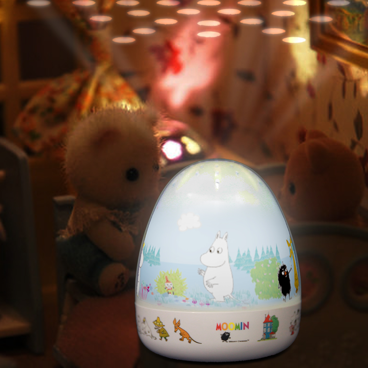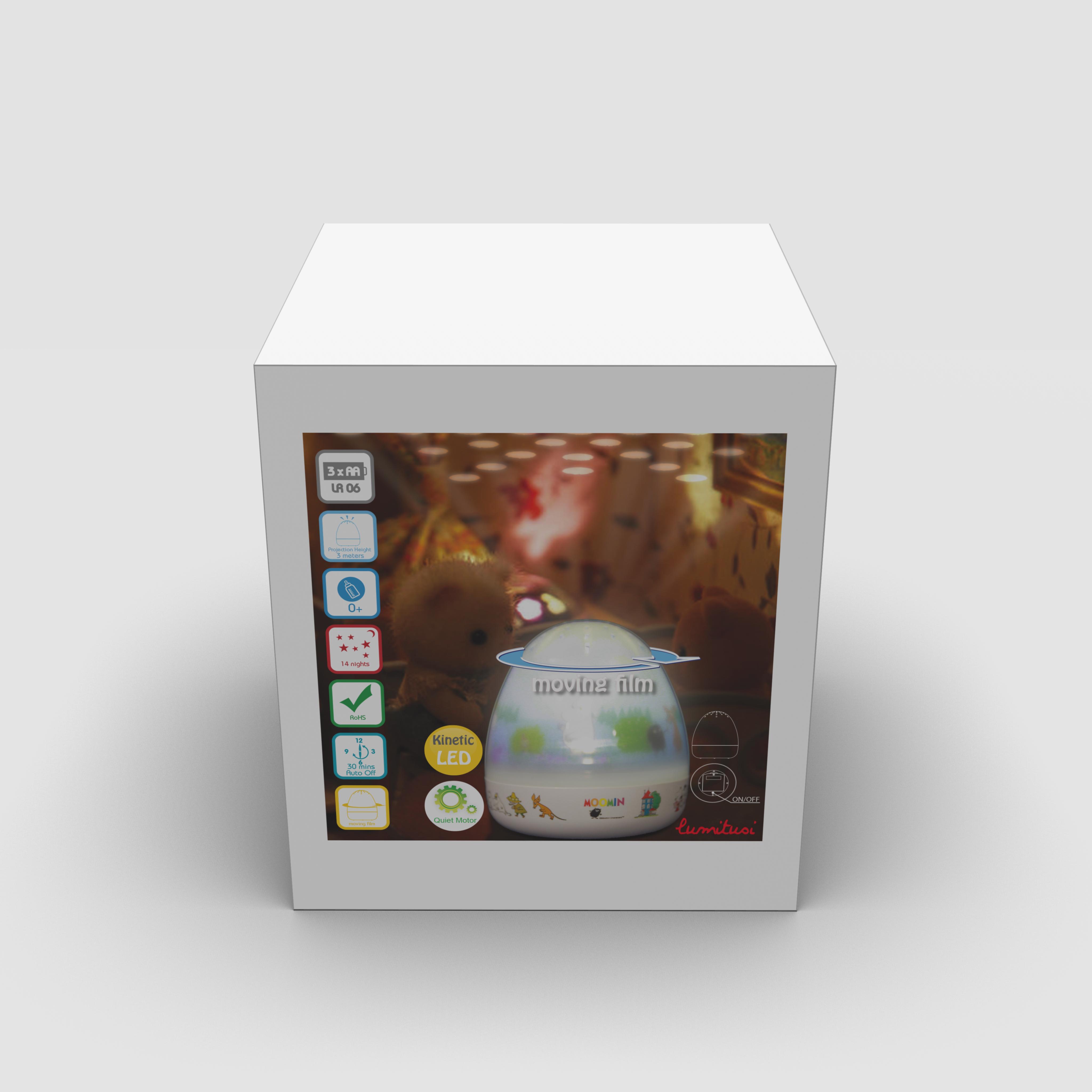 Lumitusi is proud to present the Moomin Rotational Theatre, a part of Moomin projection night light series. it is the perfect sleeping companion for young and old child with moving Moomin image, accompany with soothing lullaby. The device creates a fascinating moving starry night atmosphere by projecting onto ceiling and walls in a dark room. The built-in timer will allow 14 nights of operations for new batteries.