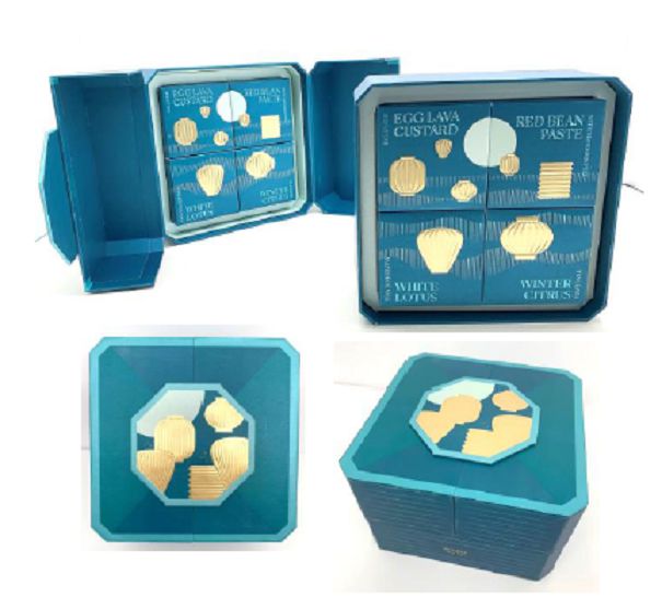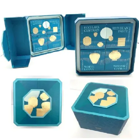 This set of blue and gold gift boxes features geometric gold patterns and unique structures. It is like capturing the moonlit shadows within the box, perfectly embodying the modern and elegant flavors of the Mid-Autumn Festival.